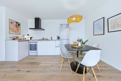 Darüber hinaus: Je nach gebuchtem Paket integrieren wir vollwertige Möbelstücke wie ein echtes Sofa, einen Esstisch sowie mehrere Sideboards und Regale, um Räume noch realistischer, hochwertiger und verkaufsstärker wirken zu lassen – und ergänzen eine Küchenattrappe, falls keine Küche vorhanden ist.